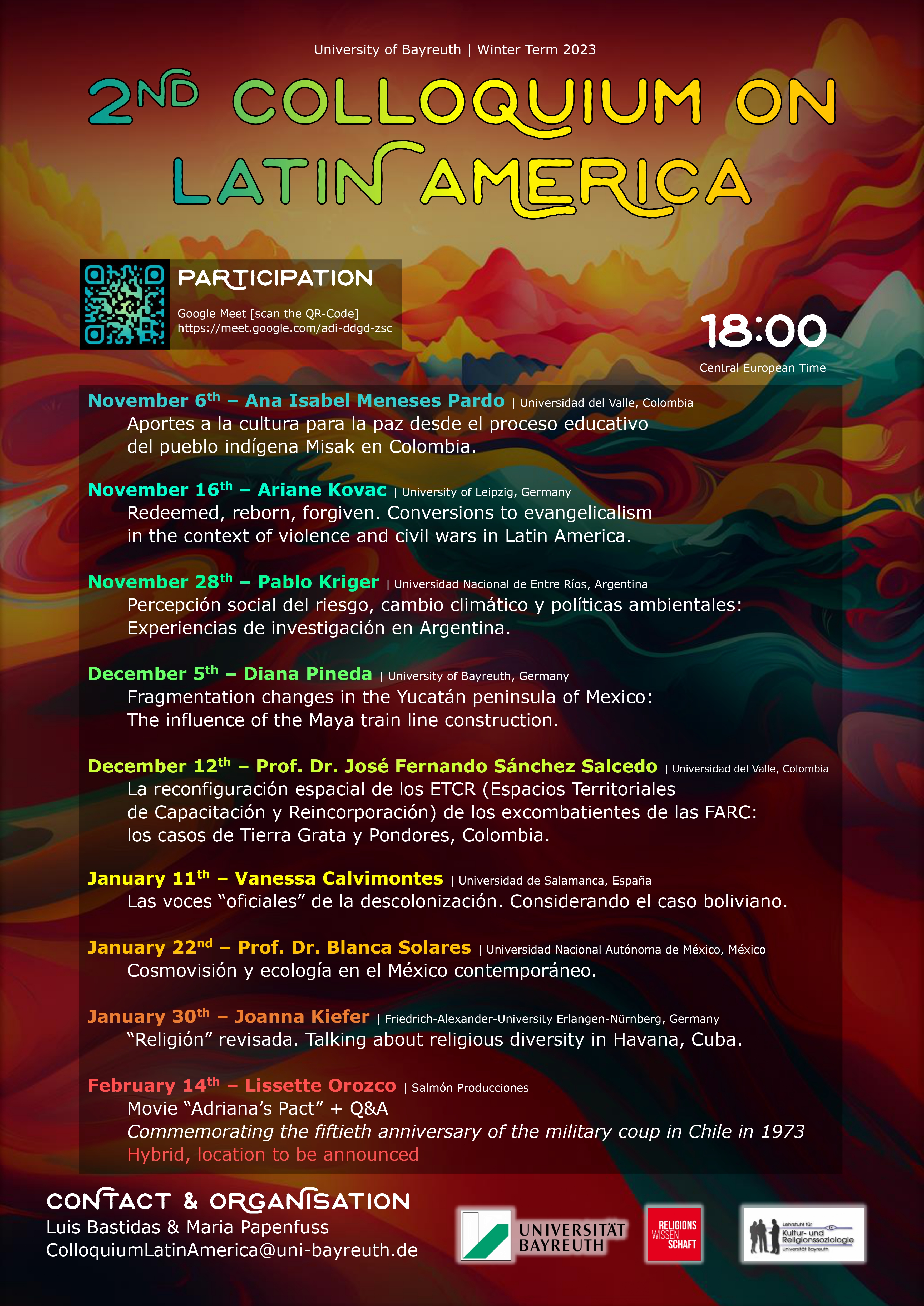 Las presentaciones serán variadas y abordarán diferentes países de la región, como Argentina, Bolivia, Colombia, Cuba y México. Algunas sesiones se llevarán a cabo en inglés y otras en español. Este semestre el coloquio será online, y sólo la última sesión será presencial, en la que tendremos un pequeño acto de conmemoración del 50 aniversario del golpe militar en Chile (1973). Presentaremos el documental "El Pacto de Adriana" y tendremos una sesión de preguntas y comentarios con la directora Lissette Orozco (lugar por anunciar).