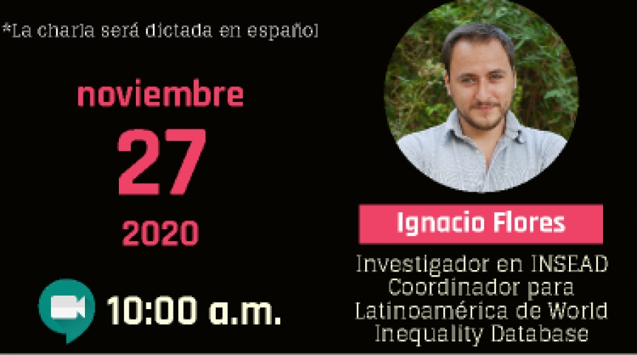 El próximo viernes 27 de noviembre, a las diez de la mañana, se realizará la conferencia “Measuring Capital-Labour Shares and Inequality: Increasing Gaps between National Accounts and Micro-data”, por Ignacio Flores, investigador posdoctoral en INSEAD - Stone center for wealth inequality y coordinador para Latinoamérica y el Caribe de World Inequality Database.