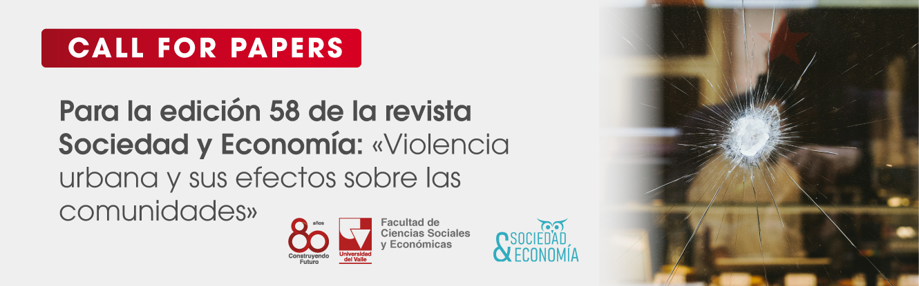 Invitamos a la comunidad académica nacional e internacional a presentar artículos para la edición 58 de la revista Sociedad y Economía sobre «Violencia urbana y sus efectos sobre las comunidades», con el objetivo de explorar esta intersección crucial desde un enfoque económico, sociológico e interdisciplinar que contribuya al desarrollo de modelos económicos y sociales más inclusivos, principalmente para economías en vía de desarrollo.