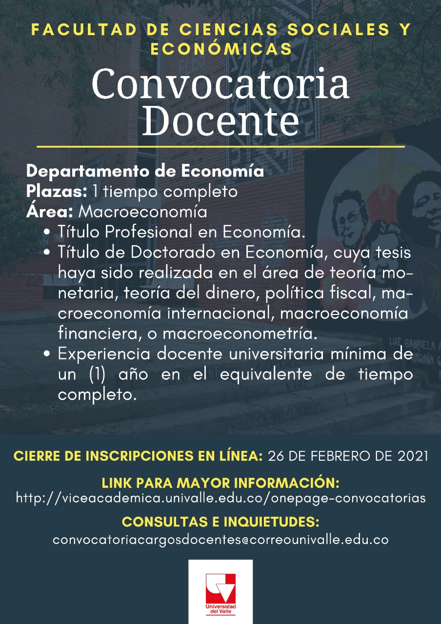 Este evento, convocado por el Departamento de Economía de la Universidad del Valle, se realizará en idioma inglés a través de la plataforma de Google Meet y también será transmitido por nuestra página de Facebook.