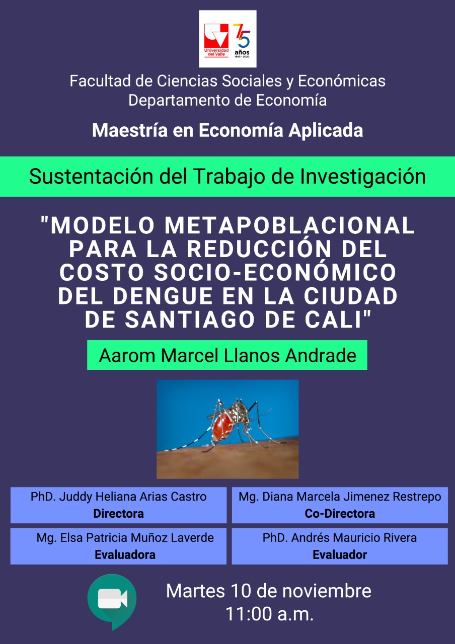 El Departamento de Economía de la Universidad del Valle invita a la sustentación de trabajo de investigación de la Maestría en Economía Aplicada titulado "Modelo meta-poblacional para la reducción del costo socioeconómico del dengue en la ciudad de Santiago de Cali", de Aarom Marcel Llanos Andrade, egresado del pregrado en Matemáticas de la Universidad del Valle, investigador y docente.