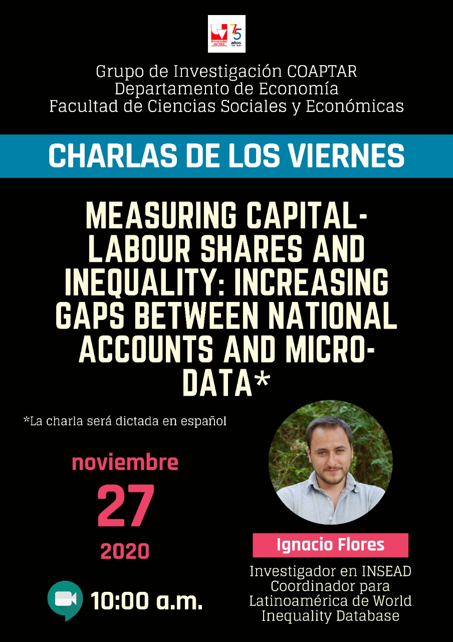 El próximo viernes 27 de noviembre, a las diez de la mañana, se realizará la conferencia “Measuring Capital-Labour Shares and Inequality: Increasing Gaps between National Accounts and Micro-data”, por Ignacio Flores, investigador posdoctoral en INSEAD - Stone center for wealth inequality y coordinador para Latinoamérica y el Caribe de World Inequality Database.