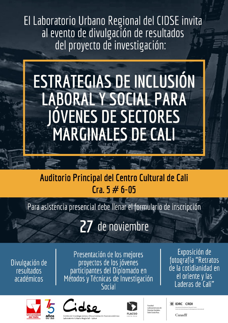 Influir sobre los procesos de formulación de política pública para mejorar las oportunidades de generación de ingresos de los jóvenes de sectores populares en Cali es uno de los principales objetivos del proyecto de investigación “Estrategias de inclusión laboral y social de jóvenes en zonas marginadas de Cali” desarrollado por la Universidad del Valle en el marco del programa Vidas Sitiadas de FLACSO-Costa Rica. Este proyecto de investigación se desarrolló con el apoyo financiero del International Development Reseach Center –IDRC- del Gobierno de Canadá y presentará sus principales resultados el próximo 27 de noviembre a las 8:00 am en el Auditorio Principal del Centro Cultural de Cali.