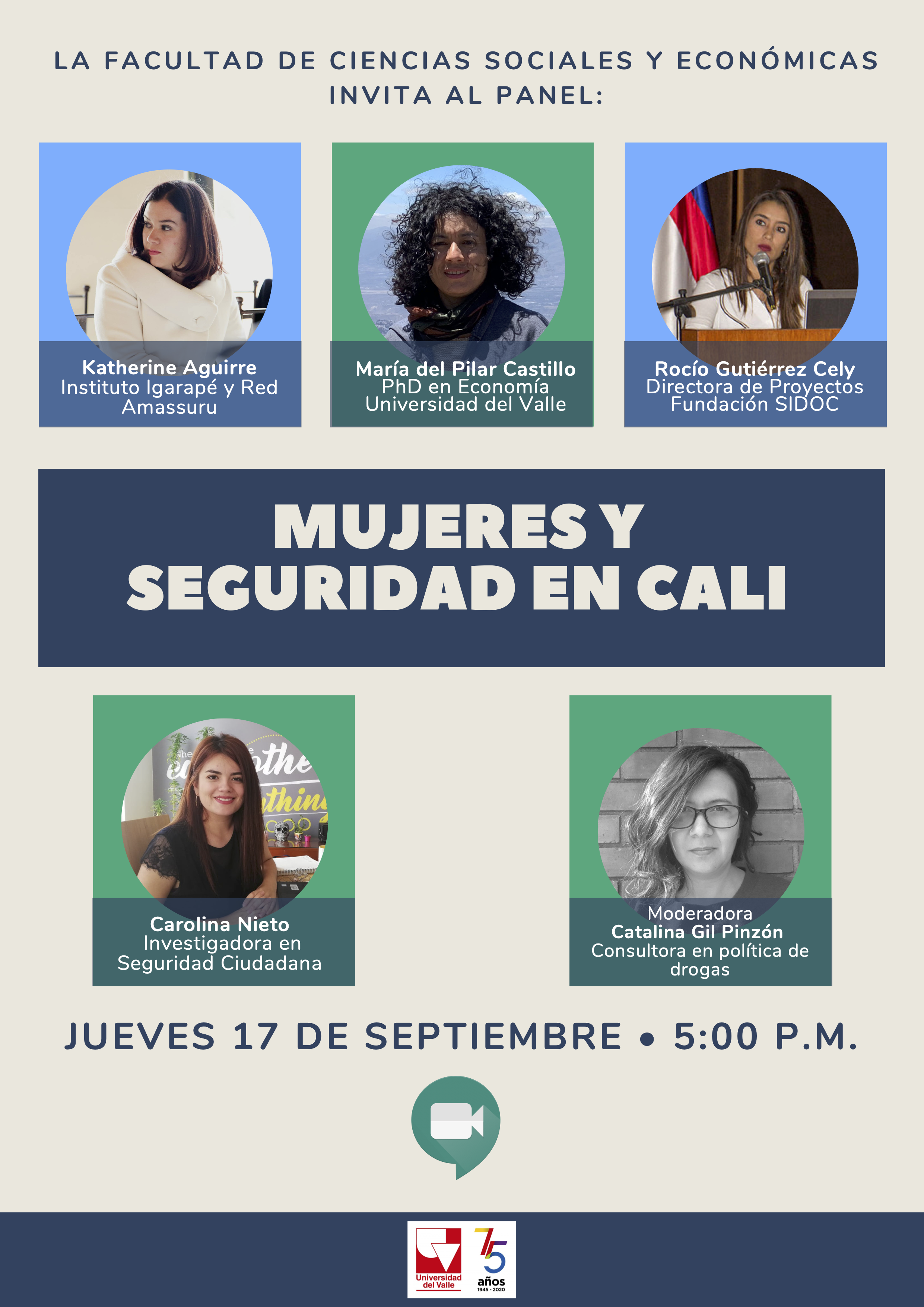 El próximo jueves 17 de septiembre, a las cinco de la tarde, se realizará el conversatorio “Mujeres y seguridad en Cali”, convocado por la Facultad de Ciencias Sociales y Económicas de la Universidad del Valle. Contará con la participación de cuatro panelistas y una moderadora: Katherine Aguirre, del Instituto Igarapé y la Red Amassuru; Rocío Gutiérrez Cely, directora de Proyectos de la Fundación SIDOC; María del Pilar Castillo, docente del Departamento de Economía de la Universidad del Valle; Carolina Nieto, investigadora en Seguridad Ciudadana de la Oficina de las Naciones Unidas contra la Droga y el Delito; y Catalina Gil Pinzón, consultora en política de drogas.