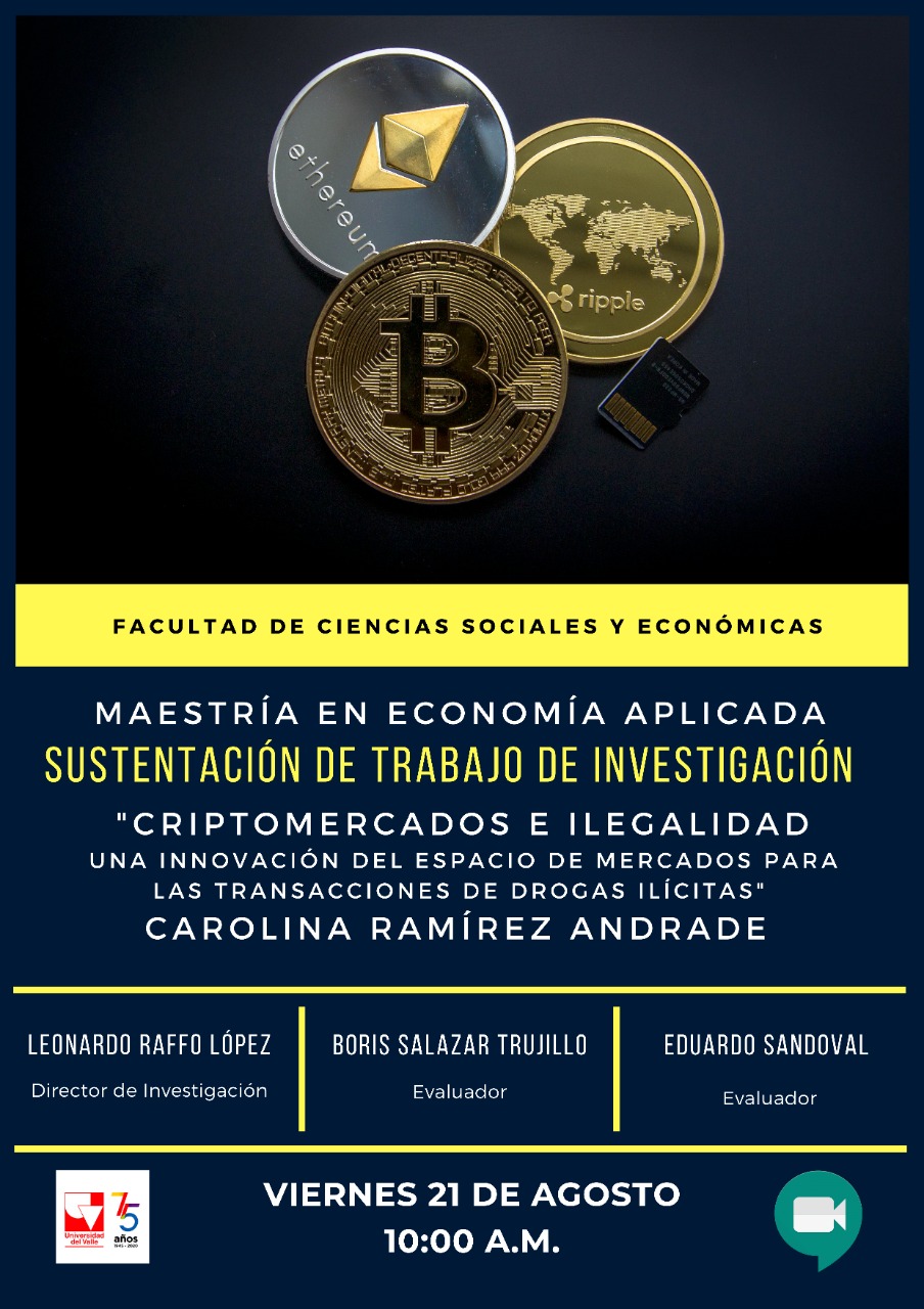 El pasado viernes 21 de agosto, a las diez de la mañana, se realizó la sustentación del trabajo de investigación "Criptomercados e ilegalidad. Una innovación del espacio de mercados para las transacciones de drogas ilícitas", de Carolina Ramírez Andrade, dirigida por el docente Leonardo Raffo López, de la Maestría en Economía Aplicada. Los docentes Boris Salazar y Eduardo Sandoval, jurados del trabajo de investigación, no solo lo aprobaron sino que además le dieron calificación meritoria.