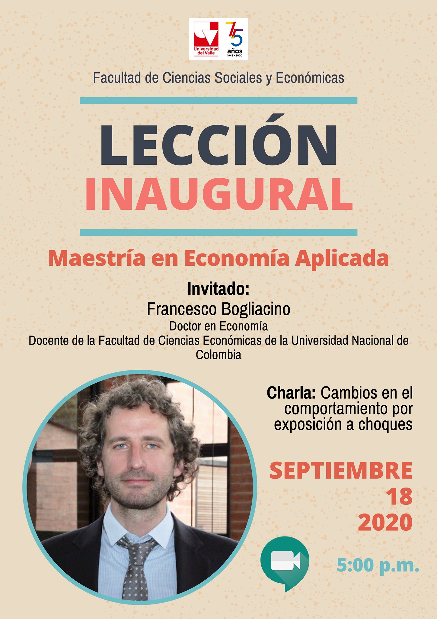 El próximo viernes 18 de septiembre, a las 5 p.m., se realizará la lección inaugural de la Maestría en Economía Aplicada, “Cambios en el comportamiento por exposición a choques”, por el profesor Francesco Bogliacino, docente de la Facultad de Ciencias Económicas de la Universidad Nacional, director del Centro de Investigaciones para el Desarrollo de la misma universidad y doctor en Economía de la Universidad de Pavía.