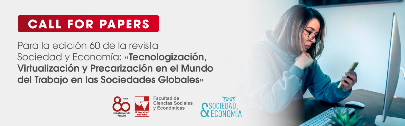 Invitamos a la comunidad académica nacional e internacional a presentar artículos para la edición 60 de la revista Sociedad y Economía que aborden los efectos de la tecnologización y virtualización en el ámbito laboral, así como las dinámicas de precarización que se han intensificado en las últimas décadas considerando los principales desafíos y avances en el campo del trabajo, tanto a nivel nacional como internacional, en el contexto de las sociedades globales.