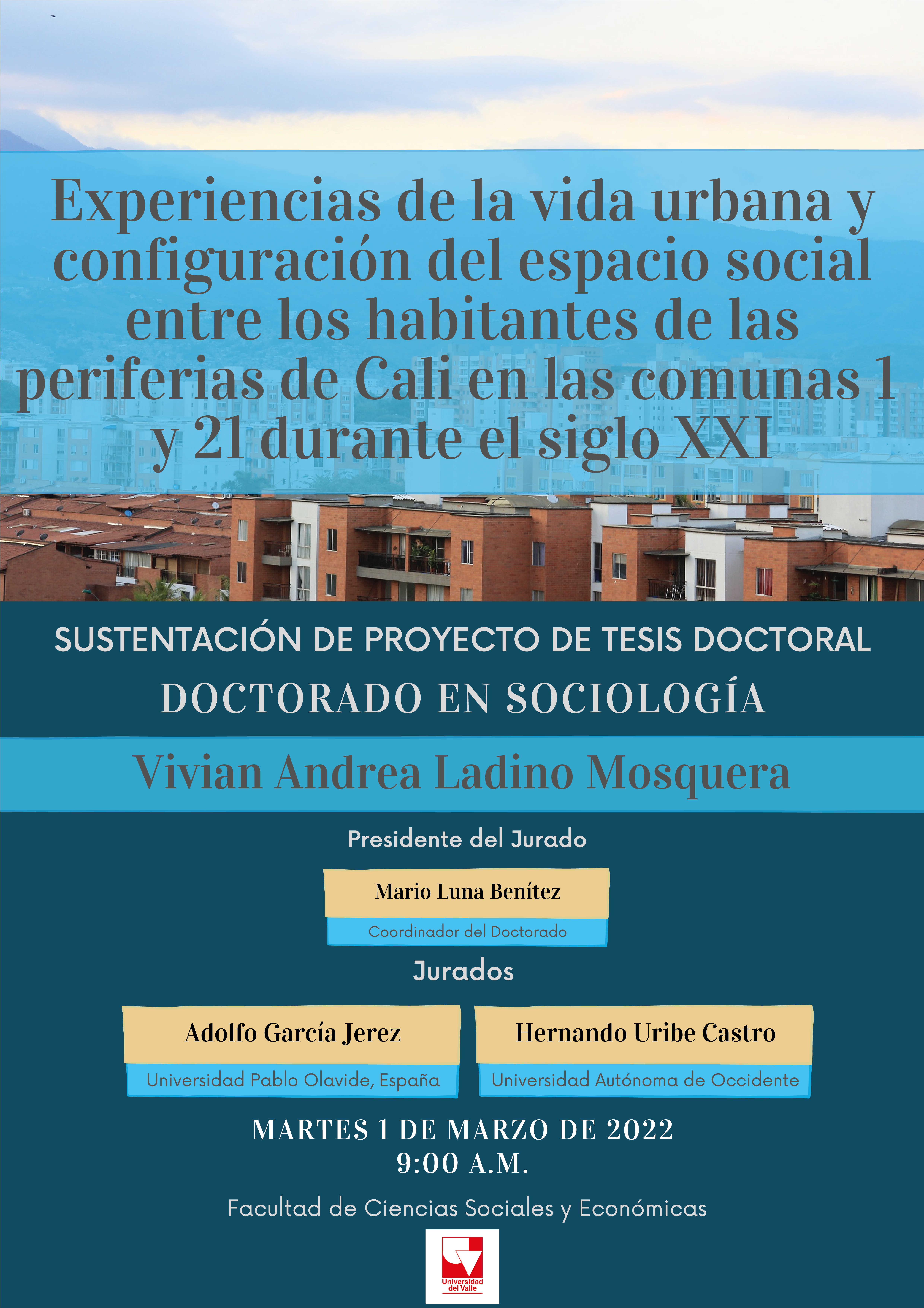 El próximo martes 1 de marzo, a las 9:00 a.m., se realizará la defensa del proyecto de investigación doctoral de Viviana Andrea Ladino Mosquera, estudiante del Doctorado en Sociología de la Universidad del Valle. El trabajo se titula “Experiencias de la vida urbana y configuración del espacio social entre los habitantes de la periferia de Cali en las comunas 1 y 21 durante el siglo XXI”.