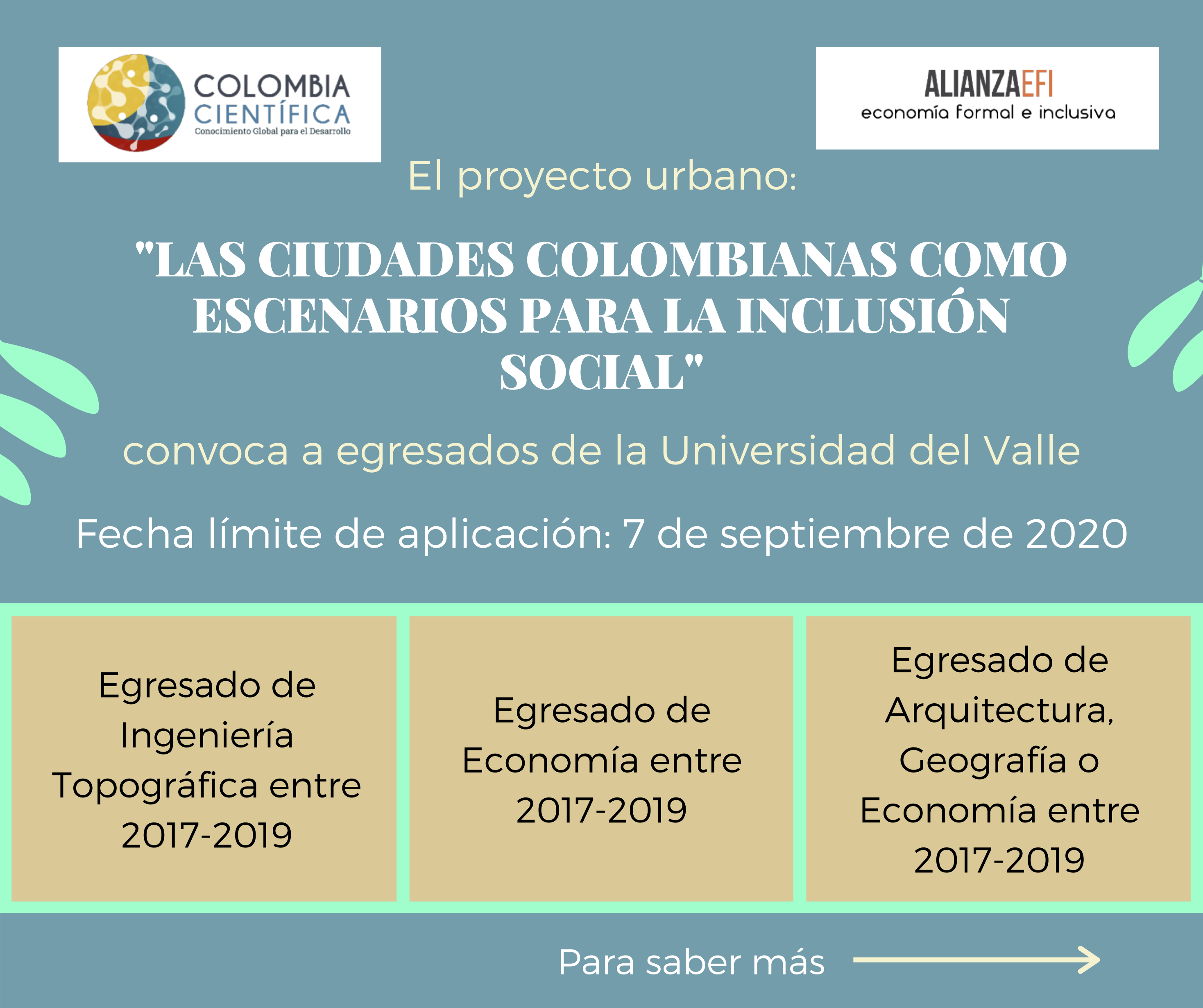 El proyecto urbano “Las Ciudades Colombianas como Escenarios para la Inclusión Social”, del programa Colombia Científica y la Alianza EFI (Economía Formal Inclusiva), convoca a egresados de la Universidad del Valle, interesados en contribuir a la creación y fortalecimiento del Observatorio de Ordenamiento Territorial, articulado al Laboratorio Urbano de la Facultad de Ciencias Sociales y Económicas.