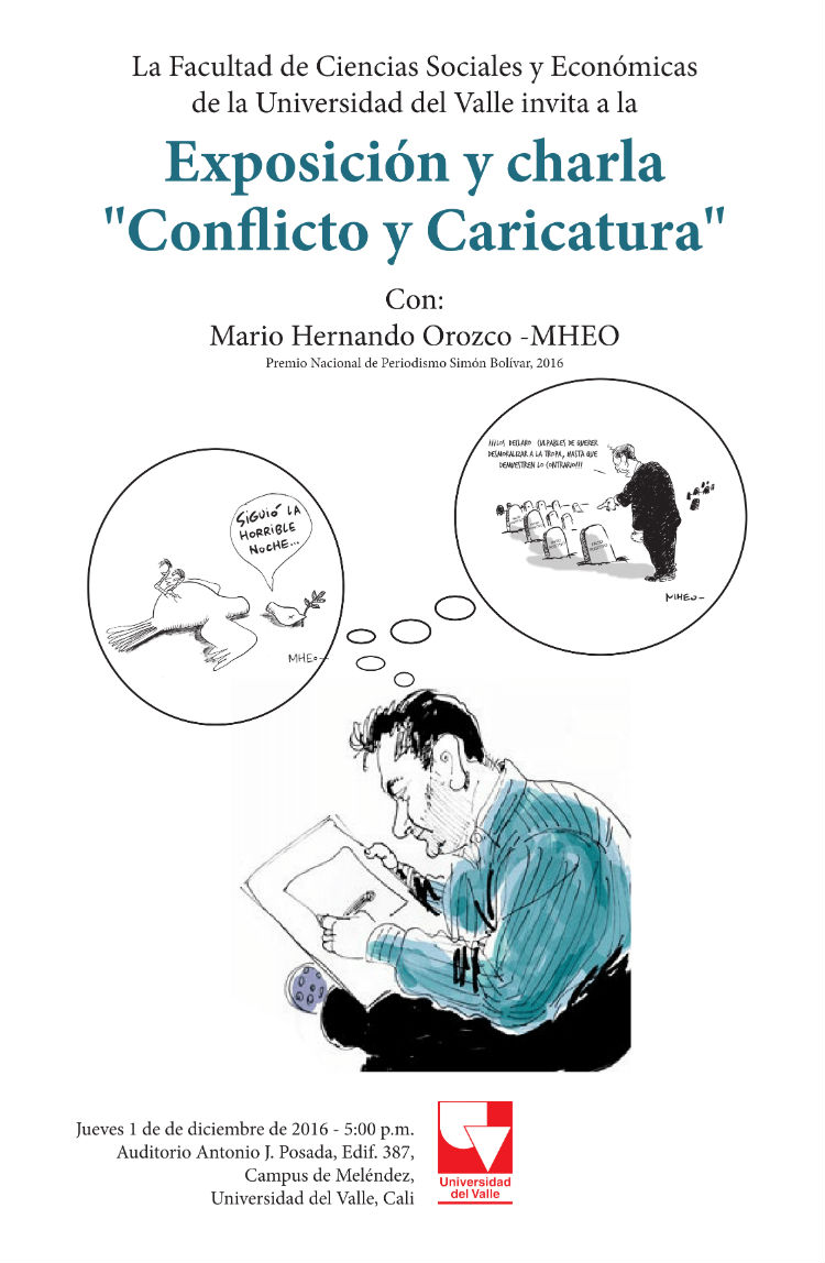 La Facultad de Ciencias Sociales y Económicas realizó la exposición "Conflicto y caricatura", que pudo verse desde el 1 y hasta 13 de diciembre pasados en los pasillos del primer piso del edificio 387 de la Facultad, cuya inauguración contó con la presencia de Mario Hernando Orozco, más conocido como “Mheo”, caricaturista pereirano que ha sido galardonado en múltiples ocasiones con el Premio Nacional de Periodismo Simón Bolívar, incluido este 2016, y quien ofreció una charla sobre su oficio a todos los asistentes; 40 de sus caricaturas fueron seleccionadas para esta exposición alrededor de varios ejes temáticos: las FARC, el Proceso de Paz, el Paramilitarismo y el Estado.